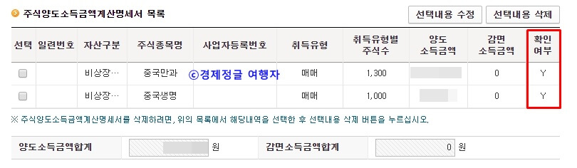 자산구분, 주식종목명, 사업자등록번호, 취득유형, 취득유형별 주식수, 양도소득금액, 감면소득금액, 확인여부가 항목을 확인합니다. 증권사 양도소득금액합계를 대조해 보니 크게 차이가 나지 않습니다.