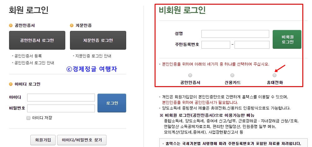 양도소득세 신고 메뉴 또는 회원 로그인/비회원 로그인를 선택합니다. 공인인증서 없이 성명, 주민등록번호 입력 후 신용카드, 휴대폰 인증 후 간편하게 이용할 수 있습니다.