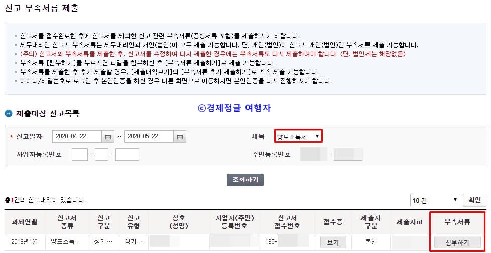 세목선택 - 조회하기 - 신고내역 1건을 확인할 수 있으며, 양도소득과세표준 신고 및 납부계산서 PDF파일, 주식 등 양도소득금액 계산명세서 PDF를 부속서류 첨부하기 버튼을 눌러서 첨부하면 끝입니다.