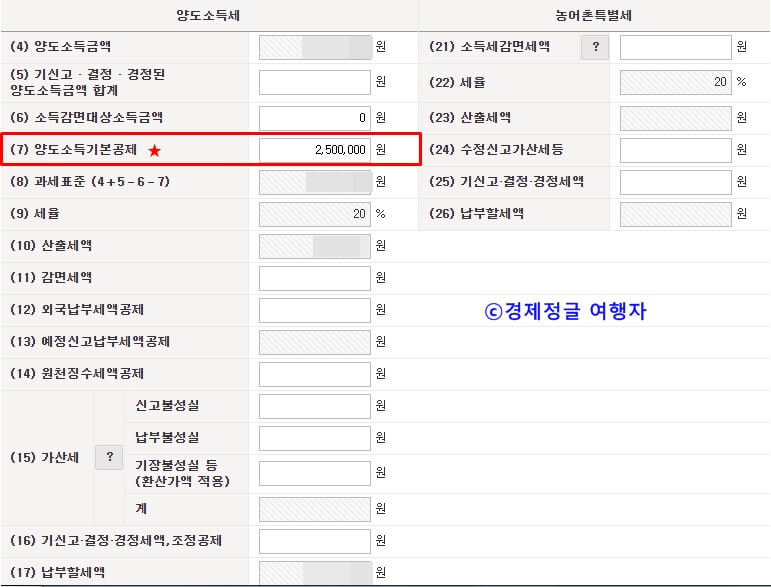 가장 중요한 (7) 양도소득기본공제에 250만원을 꼭 기재합니다.