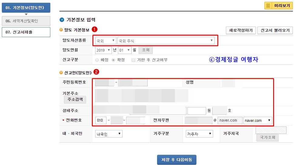 양도자산 종류를 국외-국외주식으로 선택 후, 양도연월에 있는 '조회'를 클릭합니다. 신고인(양도인)에 대한 정보(주민번호, 기본주소, 이름, 상세주소,전화번호, 이메일)를 입력합니다. 저장 후 다음이동~