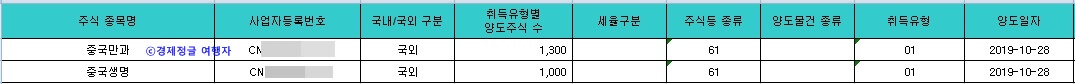 주식 종목명, 사업자등록번호, 국내/해외 구분, 취득유형별 양도주식 수, 세율구분, 주식등 종류, 양도물건 종류, 양도물건 종류, 취득유형, 양도일자, 주당양도가액, 양도가액, 취득일자, 주당취득가액, 취득가액, 필요경비, 비과세 양도소득금액, 감면종류, 감면율, 감면소득금액, 과세이연여부, 국제증권식별번호(ISIN코드), 국외자산국가코드
