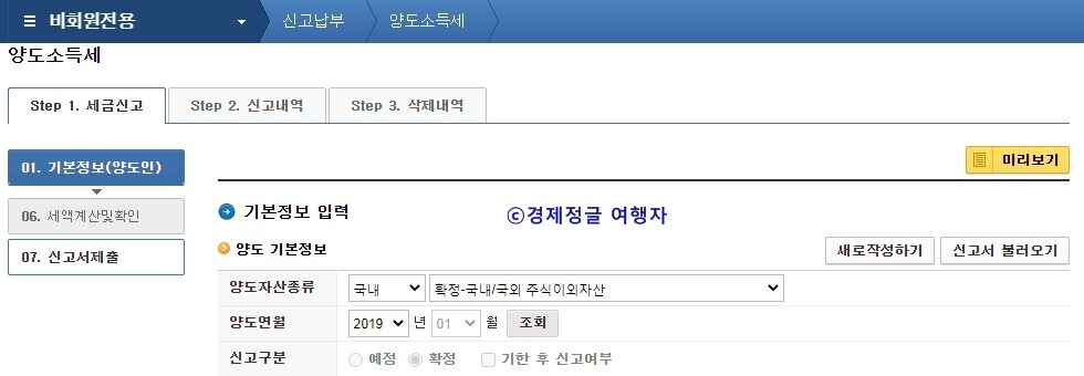 회원전용 및 비회원전용 모두 사용가능하며, 양도소득세 메뉴에서 "Step2. 신고내역"을 선택합니다.